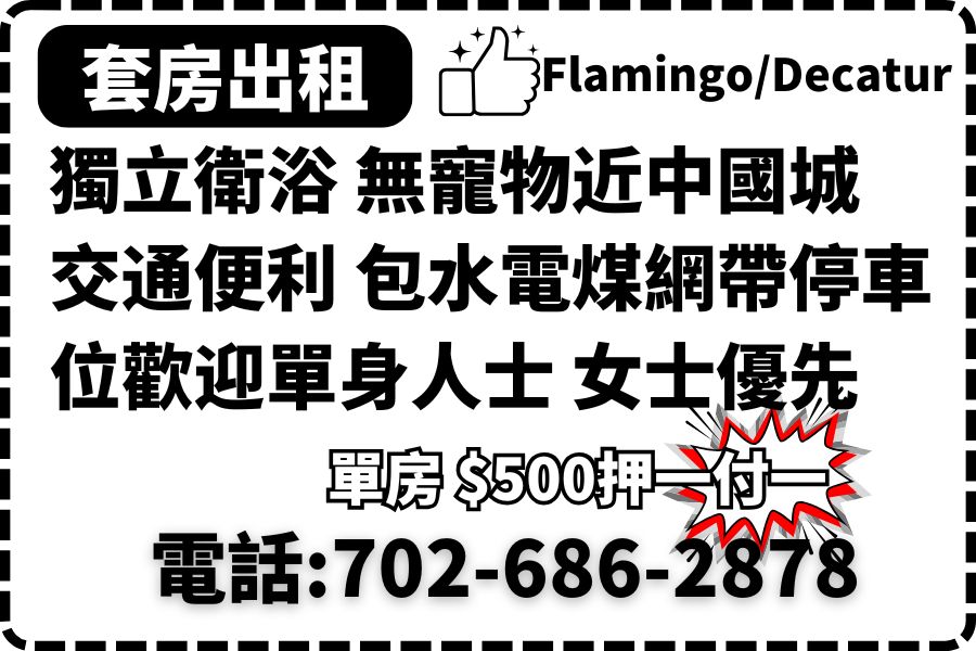 套房出租 Flamingo/Decatur 獨立衛浴 無寵物 近中國城 交通便利 包水電煤網 帶停車位