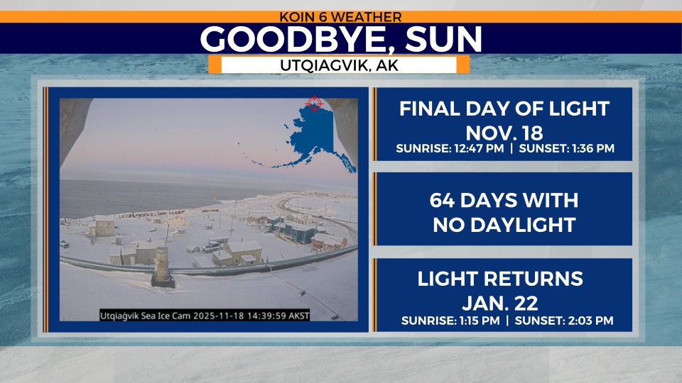 【綜合報導】美國阿拉斯加州最北端城市烏特恰維克(Utqiagvik)本週迎來今年最後一次日出(左圖),象徵當地正式踏入長達64天的「極夜」,一直到2026年1月22日,5千名居民都必須在連續黑暗與零下酷寒中度過北極冬季。