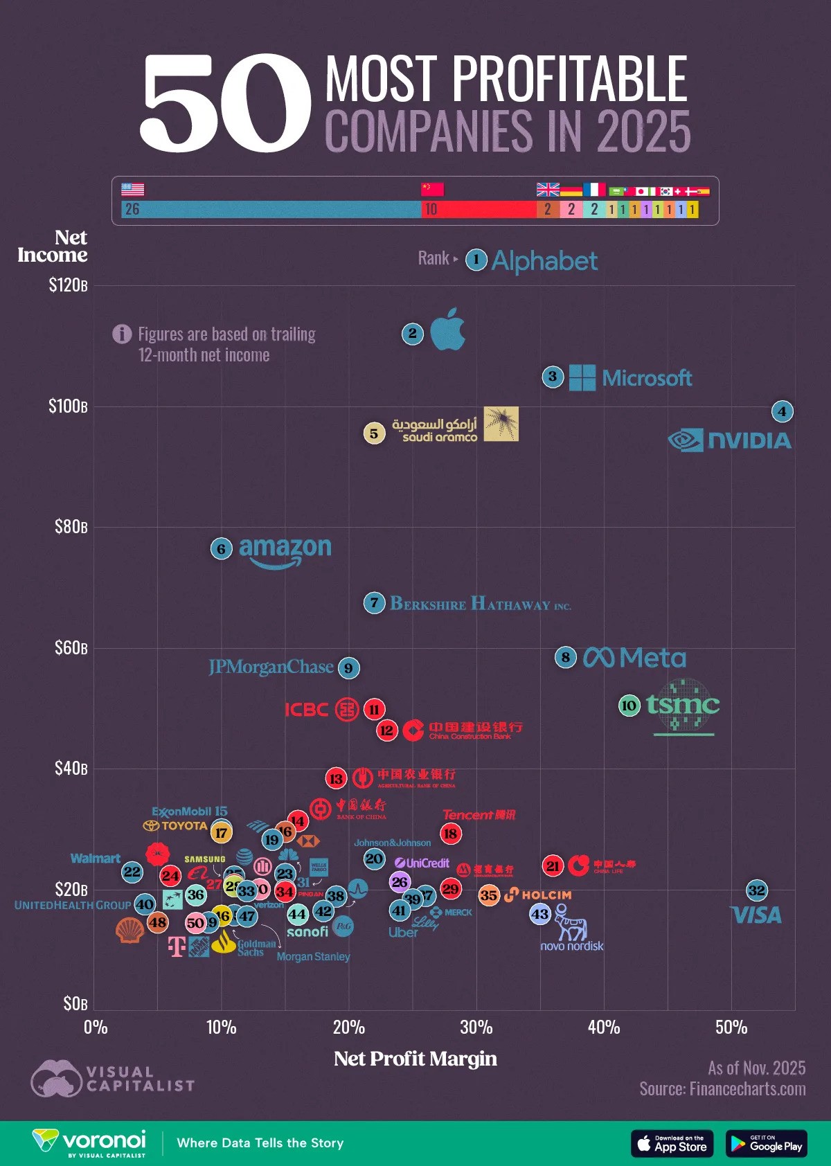 根據《資本視覺》統計截至2025年11月、過去12個月的企業淨利數據,科技產業依然牢牢佔據獲利榜單的前段班。Alphabet憑藉龐大的搜尋引擎與廣告業務高居榜首,蘋果(Apple)與微軟(Microsoft)則分居第二、三名。