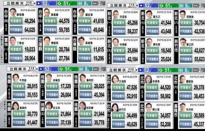 所有選區“不同意票”均高於“同意票”。例如,臺北第七選區(徐巧芯),同意罷免票 5.6 萬,不同意票 6.3 萬,投票率 33.2%。新竹市(高虹安),同意票 3.8 萬,不同意票 5.2 萬,投票率 29.7% 。