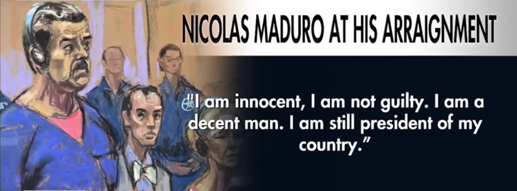 週一上午,馬杜羅與妻子弗洛雷斯被束帶捆住,從布魯克林大都會拘留中心由直升機轉運至曼哈頓華爾街起降場,隨後進入法院。美方檢察官對其提出包括「毒品恐怖主義陰謀」、「可卡因走私」及「持有機槍」在內的四項刑事控罪。