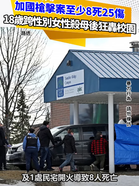 加拿大西部卑詩省(British Columbia)坦布勒嶺鎮(Tumbler Ridge)10日發生重大校園槍擊事件。1名身著長裙的槍手當地1所中學及1處民宅開火導致8人死亡,另有至少25人受傷,槍手事後自戕。加拿大警方已確認槍手為1名18歲跨性別女子,曾有精神健康方面病史。 根據《衛報》報導,加拿大警方最初稱有9人死亡,但加拿大皇家騎警副總長麥克唐納(Dwayne McDonald)11日澄清,實際死亡人數