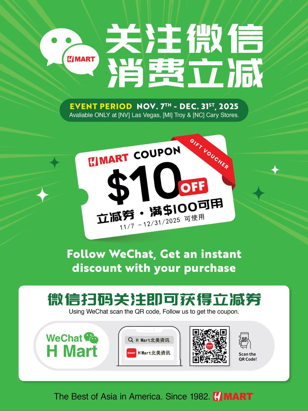 美洲最大的亞洲超市連鎖品牌 H Mart,將於2025年11月7日至12月31日為期兩個月,在內華達(NV)、密西 根(MI)及北卡羅來納(NC)地區舉辦微信新用戶關注優惠活動。 活動期間,凡是首次關注H Mart微信官方帳號(HMART北美资讯)的顧客,即可獲得一張可於上述三州H Mart 門店使用的10美元立減券(消費滿$100使用)。 H Mart的微信官方帳號提供顧客豐富的便利功能與最新資訊,包括每週