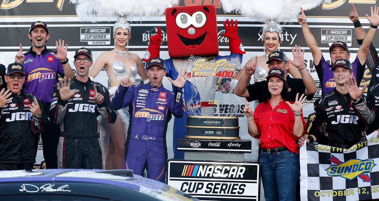 記者晨楓報導,NASCAR車手丹尼哈姆林(Denny Hamlin)週日在拉斯維加斯賽道舉行的「南點400」(South Point 400)賽事中奪冠,拿下職業生涯第60場NASCAR盃系列賽勝利,成功晉級鳳凰城總決賽(Championship 4),成為賽史傳奇之一。 哈姆林駕駛喬吉布斯車隊(Joe Gibbs Racing)11號豐田賽車,從桿位起跑並一路穩定領先,延續近年「冠軍皆從前十名起跑」的趨勢。這是他在拉斯維加斯的第二場