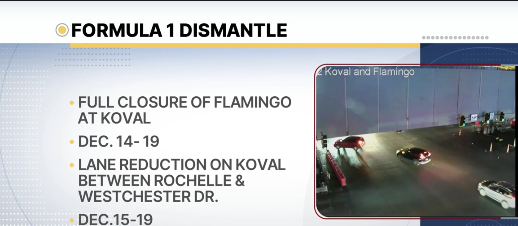 記者晨楓報導,拉斯維加斯市府宣布,為拆除 F1 拉斯維加斯大獎賽期間搭建的臨時橋樑,Flamingo Road 於 Koval Lane 路段將自 12 月 14 日晚間起封閉至 12 月 19 日晚間,為期一週。 市府表示,工程期間周邊商家與飯店仍可進出,但多條公車路線將改道,並實施臨時班表。另有多項與賽事相關的拆除工程同步進行,包括 Bellagio Fountain Club 的拆卸作業,將造成拉斯維加斯大道部分車道與人