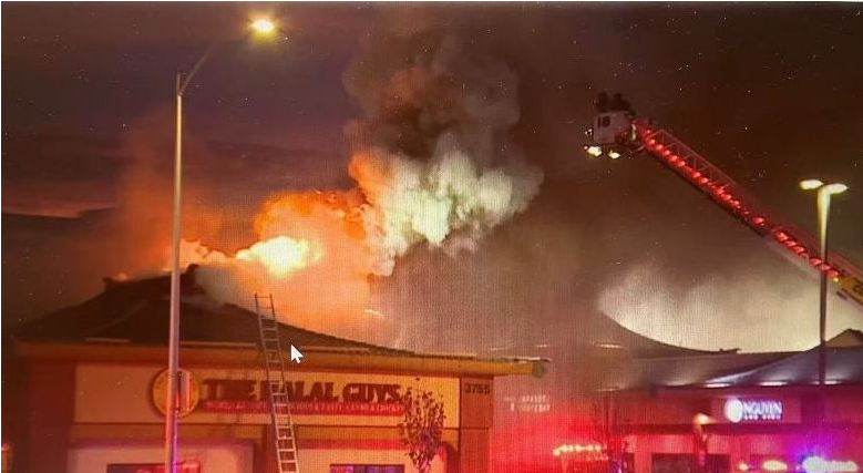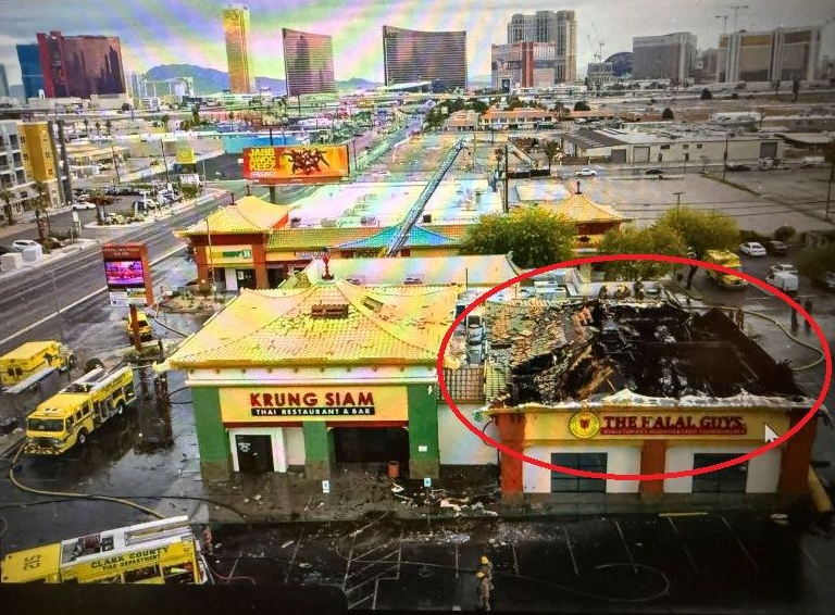 記者李英報導,本週五清晨,拉斯維加斯唐人街(Chinatown)發生一起嚴重的商業建築火災,滾滾濃煙與火舌一度直衝天際。克拉克縣消防局(CCFD)表示,火警發生於凌晨 5 時 50 分左右,地點位於春山路(Spring Mountain Road)與谷景大道(Valley View Boulevard)交會處附近的一座條狀商場建築。該建築內設有三家商店,起火點被確認位於其中一家餐飲設施內。