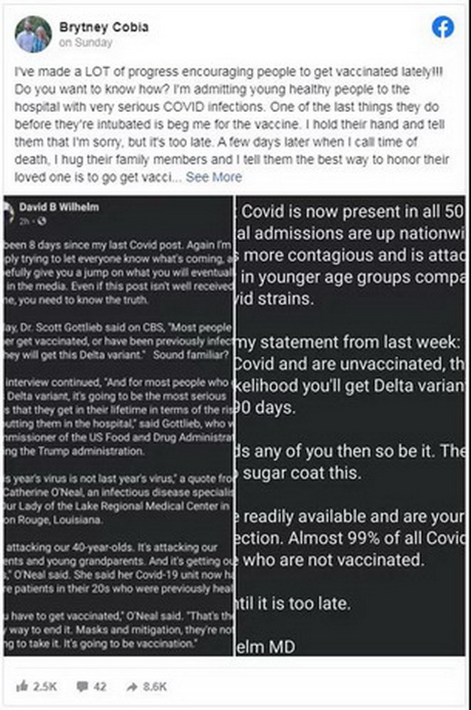 美國阿拉巴馬州職業醫師科比雅(Brytney Cobia)博士在臉書發文表示,許多先前未接種的患者染疫後病況較嚴重,他們在插管前最後一個請求就是希望能接種疫苗,但科比雅卻只能握著病患的手,無奈地拒絕道,“很抱歉,已經太遲了。”