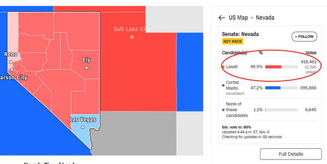 內華達州成為參議院兩黨爭奪的焦點。內州候選人Laxalt已取得49.9%的選票。儘管還未宣佈,但已幾乎取勝。內州取勝後,共和黨還需再取得一個席位。