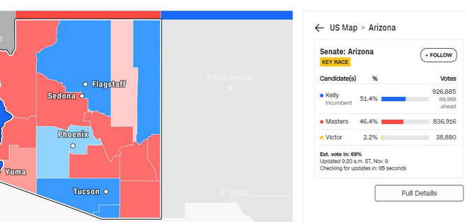 下一焦點在亞利桑那州。該州已計票69%,民主黨贏得51.4%的選票,共和黨46.4%。民主黨能否保持贏面,還有待觀察。