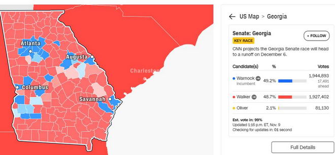 另一個可能有變數的是喬治亞州。該州已計票99%,民主黨贏得49.2%的選票,共和黨48.7%。共和黨在喬治亞州取勝的可能性不大。但通常城市計票速度一般較快,農村較慢,農村選民更多支持共和黨。所以共和黨拿下喬治亞州也不無可能。