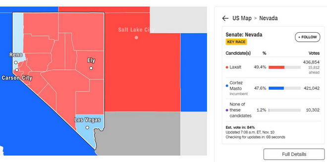參議院選戰中,內華達州已點票84%,共和黨以49.4%:47.6%的小幅優勢幾乎贏得內華達州。