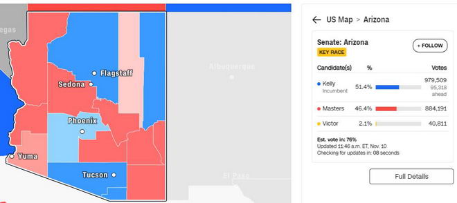 共和黨多半會在亞利桑那州敗選。該州已計票76%,民主黨贏得51.4%的選票,共和黨46.4%。