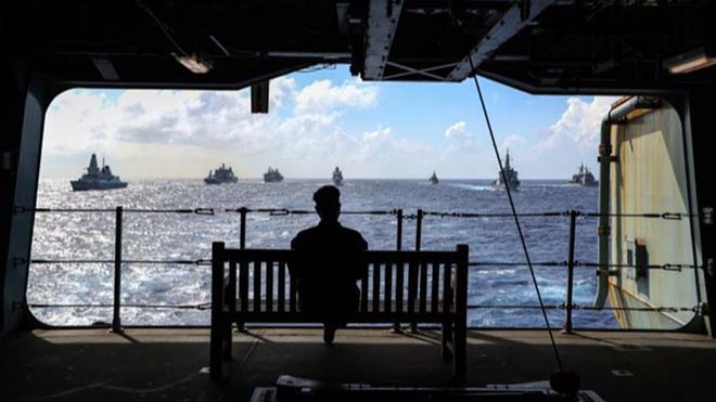 英國皇家海軍伊麗莎白女王號航空母艦打擊群指揮官坐在艦尾觀看多國編隊航行。