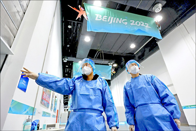 消毒人員在冬奧媒體中心執行清潔消毒工作,場外也有保全人員駐守。