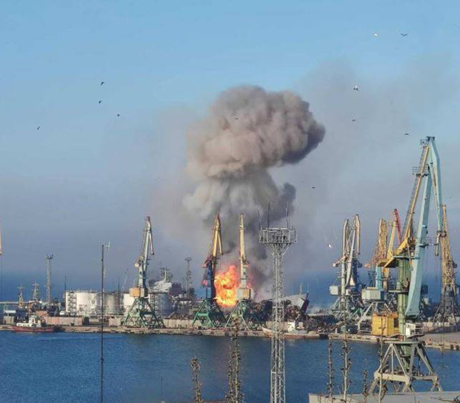 被俄軍佔領的別爾江斯克港口城市今日傳出爆炸起火事件,現場爆出爆炸火光,濃濃黑煙直竄天際,烏克蘭海軍則在官方臉書貼出照片、影片,稱今上午7時在別爾江斯克港內摧毀俄羅斯黑海艦隊大型登陸艦(船塢登陸艦)「奧爾斯克號」。