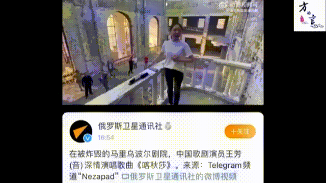 星期四,俄羅斯官方公佈的視頻顯示,被形容為中國“歌劇歌手”的王芳在馬里烏波爾劇院用中文高唱蘇聯歌曲《喀秋莎》。俄羅斯社交媒體和媒體說,王芳等一行的多位中國名人訪問了俄羅斯扶持成立的“頓涅茨克人民共和國”。
