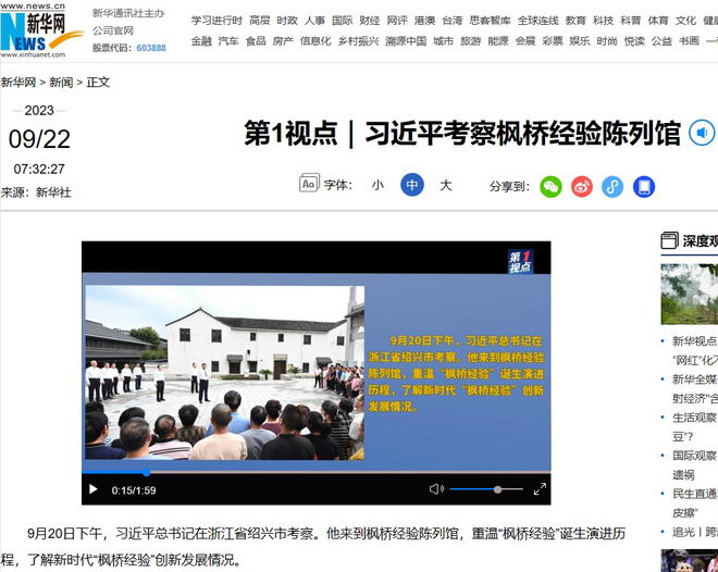 點連結進入中國官媒報導: 第1視點|習近平考察楓橋經驗陳列館-新華網。