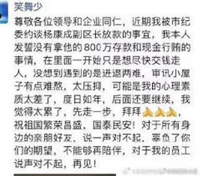 中媒《第一財經》報導,承勇當時在朋友圈發消息說,他發誓自己沒有拿楊康成的800萬人民幣存款和賄賂,“在裡面(指被紀委約談)一開始只是想儘快交錢走人,沒想到遇到的是進退兩難,審訊小屋子有點難熬太壓抑……後面還要繼續,我覺得太累了先走一步,拜拜。”