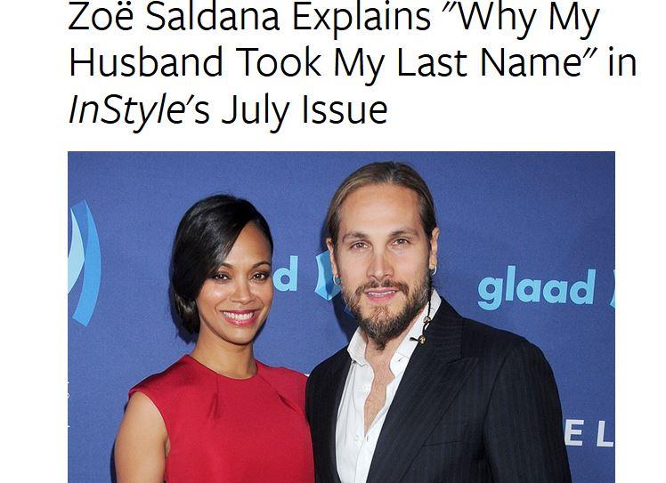 36歲的柔伊莎達娜(Zoe Saldana)接受7月號InStyle雜誌專訪時說,最初聽到藝術家老公普瑞葛歐(Marco Perego)說想要冠上她的姓氏時,她完全不同意,大力說服他打消念頭。