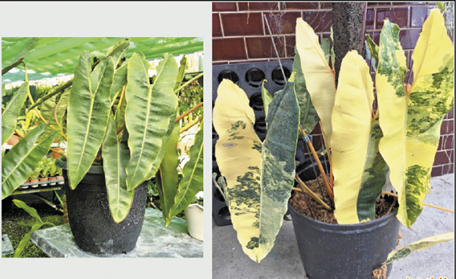 花園業者從泰國花65萬元買進一盆斑葉橘柄蔓綠絨(圖左),日前放在