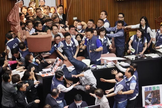 (綜合報導)5月17日(週五),臺灣立法院爆發多人肢體衝突,國民黨女立委陳菁徽遭民進黨男立委鍾佳濱撲倒抱腰襲臀,民眾黨團總召黃國昌遭民進黨立委郭國文掌摑。郭國文隨後還搶走立法院秘書長周萬來的議事本,拔腿開溜。
